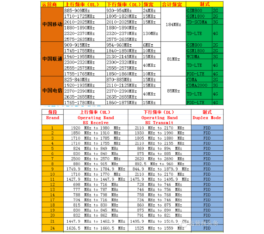 3、中國電信:825-835(上行)、870-880Mhz(下行)。